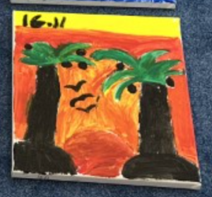 | Elementary 1st Prize | Ameena Ali | Good use of space, on point with the theme, neat brush strokes, good color scheme of cool and warm colors |